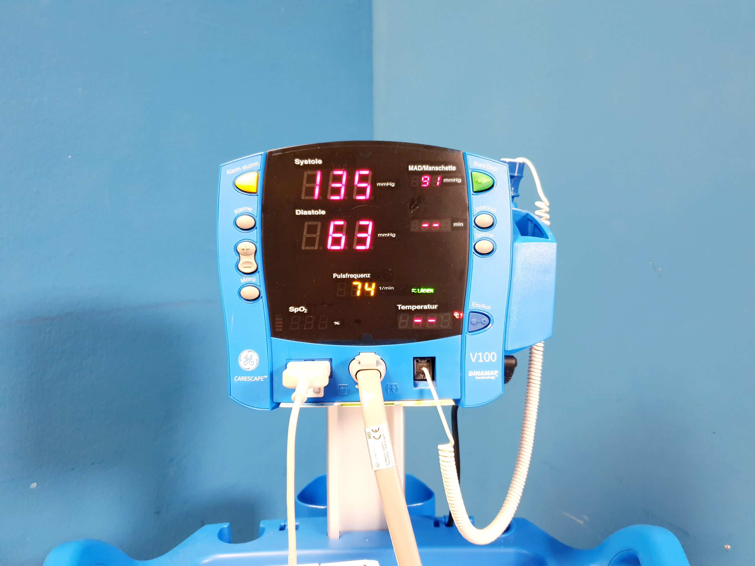 - Vielseitige Parameterüberwachung: Der Carescape V100 erfasst kontinuierlich und simultan eine Vielzahl von lebenswichtigen Messgrößen, darunter EKG, Pulsfrequenz, Blutdruck (invasiv und nicht-invasiv), Sauerstoffsättigung (SpO2), Atemfrequenz und Temperatur.