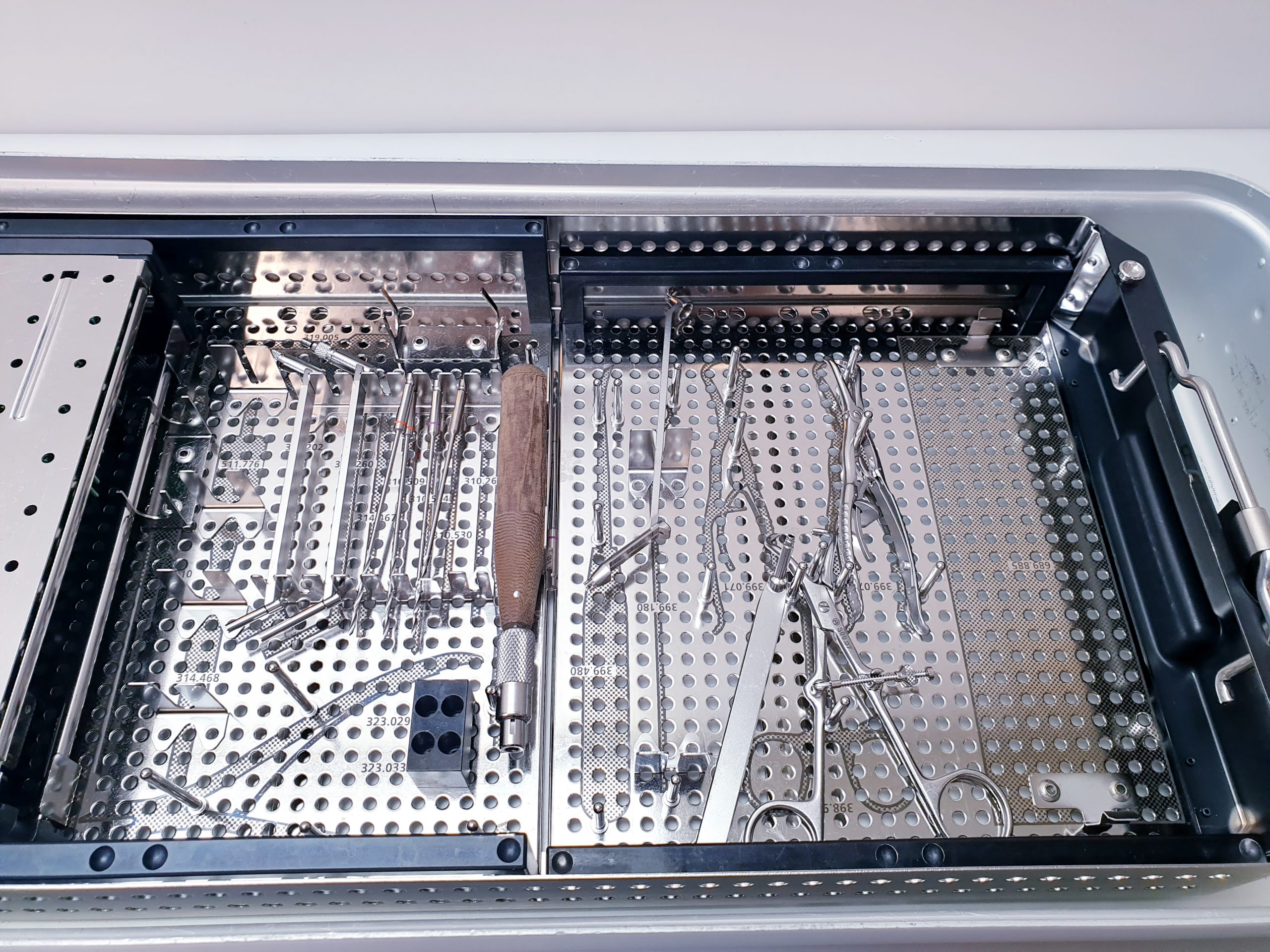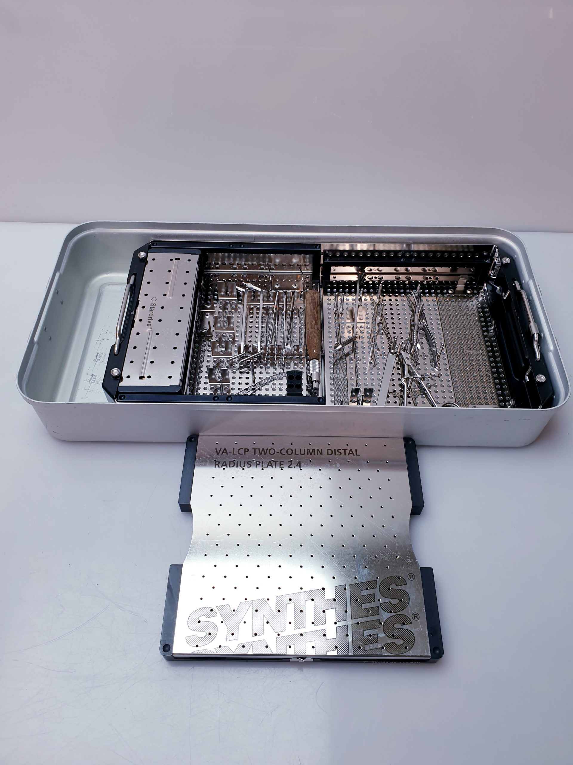 Das zugehörige Operationsinstrumentarium ist speziell auf die Handhabung der VA-LCP Two-Column Distal Radius Plate abgestimmt und unterstützt den Operateur durch präzise Bohr- und Schraubwerkzeuge, die eine sichere und effiziente Implantation gewährleisten. Die Instrumente sind ergonomisch gestaltet und ermöglichen eine exakte Positionierung der Platte sowie der Schrauben unter minimalem Gewebetrauma.